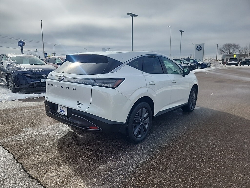 New Price! Certified. Everest White Pearl Tricoat 2025 Nissan Murano SL AWD 9-Speed Automatic I4 Murano SL, 4D Sport Utility, I4, 9-Speed Automatic, AWD, Everest White Pearl Tricoat, Graphite w/PVC (Leatherette) Seat Trim, 20" Alloy Wheels, Auto High-beam Headlights, Heated front seats, Memory seat, Navigation system: NissanConnect with Navigation and Services, Power driver seat, Power Liftgate, Power moonroof: Panoramic, Power passenger seat, PVC (Leatherette) Seat Trim, Radio: NissanConnect w/Hybrid Radio.