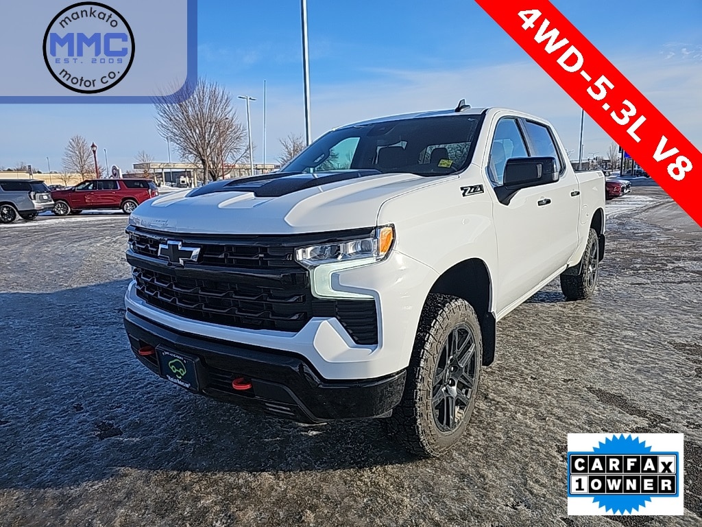 Summit White 2023 Chevrolet Silverado 1500 LT Trail Boss 4WD 10-Speed Automatic EcoTec3 5.3L V8 **SHORT BOX**, **5'8" BOX**, Silverado 1500 LT Trail Boss, 4D Crew Cab, EcoTec3 5.3L V8, 10-Speed Automatic, 4WD, Summit White, Jet Black w/Cloth Seat Trim, 10-Way Power Driver Seat w/Lumbar, 12.3" Multicolor Reconfigurable Digital Display, 120-Volt Bed Mounted Power Outlet, 120-Volt Instrument Panel Power Outlet, 6-Speaker Audio System, All-Weather Floor Liner (LPO) (AAK), Apple CarPlay/Android Auto, Auto-Locking Rear Differential, Black Name Plates (LPO), Bluetooth® For Phone, Chevrolet Connected Access Capable, Chevytec Spray-On Black Bedliner, Color-Keyed Carpeting Floor Covering, Compass, Convenience Package, Dark Essentials Package (LPO), Deep-Tinted Glass, Dual Rear USB Ports (Charge Only), Dual-Zone Automatic Climate Control, Electric Rear-Window Defogger, Electrical Steering Column Lock, Electronic Cruise Control, EZ Lift Power Lock & Release Tailgate, Front LED Fog Lamps, HD Rear Vision Camera, Heated Driver & Front Outboard Passenger Seats, Heated Power-Adjustable Outside Mirrors, Heated Steering Wheel, Heavy-Duty Air Filter, High Gloss Black Mirror Caps, Hill Descent Control, Hitch Guidance, Inside Rear-View Mirror w/Tilt, Keyless Open & Start, LED Cargo Area Lighting, OnStar & Chevrolet Connected Services Capable, Performance Red Recovery Hooks, Power Front Windows w/Driver Express Up/Down, Power Front Windows w/Passenger Express Down, Power Rear Windows w/Express Down, Preferred Equipment Group 2LT, Protection Package, Rear 60/40 Folding Bench Seat (Folds Up), Rear Wheelhouse Liners, Remote Vehicle Starter System, SiriusXM w/360L, Standard Tailgate, Steering Wheel Audio Controls, Suspension Package, Theft Deterrent System (Unauthorized Entry), Trailering Package, Wheels: 20" x 9" High Gloss Black Painted Alum, Wi-Fi Hot Spot Capable, Wireless Phone Projection, Wrapped Steering Wheel.